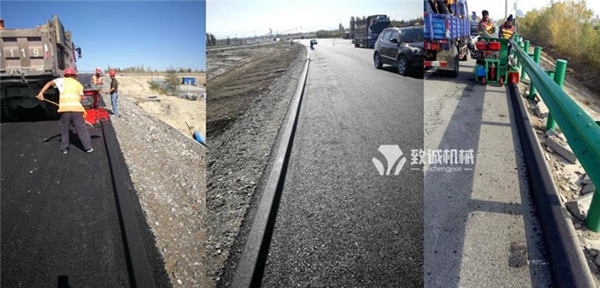 瀝青砂攔水帶成型機施工方法:施工放樣→安放攔水帶成型機→瀝青混合料的拌和與運輸→上料→牽引→跟機→清理
